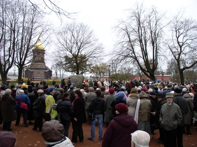 Затем выступила Н.Л.Евдокимова, бывший депутат ЗакСа, ответственный секретарь Правозащитного совета Петербурга. «И член партии «Яблоко» - добавила уже сама Наталья Евдокимова. Прежде всего она поблагодарила всех, чьими стараниями слышен голос замученных и безвинно убиенных людей. «Вы посмотрите, между нами так мало молодых. Почему? Да потому что в который раз в нашей стране пытаются изменить, переписать историю. Сталин у нас, оказывается, эффективный менеджер. И то, что он делал – это «лес рубят – щепки летят». Это как? Если это внушается нашей молодежи, то потом ты с ужасом слышишь такое: «Да ничего там не было. Что вы выдумываете? Ну пару десятков врагов народа…» Вы понимаете. К чему мы идем? И это приводит к тому, что сегодня есть тоже политзаключенные. Через год 75 лет великому террору, а мы имеем политзаключенных в стране, которая это пережила». Н.Евдокимова сказала, что сейчас идет сбор средств помощи политзаключенным: «Кто-нибудь из нас мог думать об этом 20 лет тому назад? Друзья мои, если не мы, то кто? Только нашими словами, делами, книгами мы можем сохранить память о той величайшей трагедии наших людей. Не дай нам бог повторения той трагедии!»