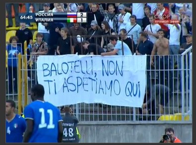 12 августа в Петербурге состоялся матч сборных России и Италии. В составе итальянцев на поле вышел темнокожий форвард «Интера» Марио Балотелли, о возможной покупке которого клубом "Зенит" недавно сообщила итальянская пресса. Фанаты "Зенита" вывесили баннер на итальянском "Балотелли, мы тебя здесь не ждем".