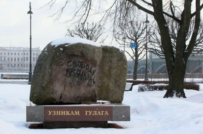 Соловецкий камень - памятник жертвам политических репрессий с четырьмя надписями на гранях богомоловского постамента: "Узникам Гулага", "Борцам за свободу", "Жертвам коммунистического террора", "Хотелось бы всех поименно назвать".