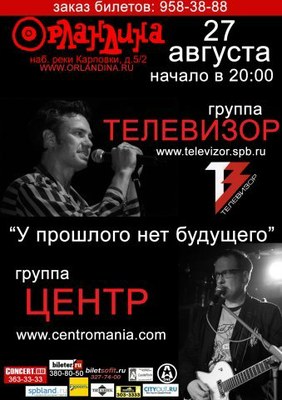 Концерт в клубе «Орландина» открыла группа «Центр», играющая андеграундную и экспериментальную, рок и электронную музыку с конца 1970х. Лидер группы Василий Шумов, перебравшийся обратно в Москву в начале этого года из Лос-Анджелеса, где он прожил с 1990 года, сегодня старается быть общественно актуальным и реагировать на российские социальные проблемы. Собственно, название последнего альбома группы и стало названием совместного с «Телевизором» концерта.