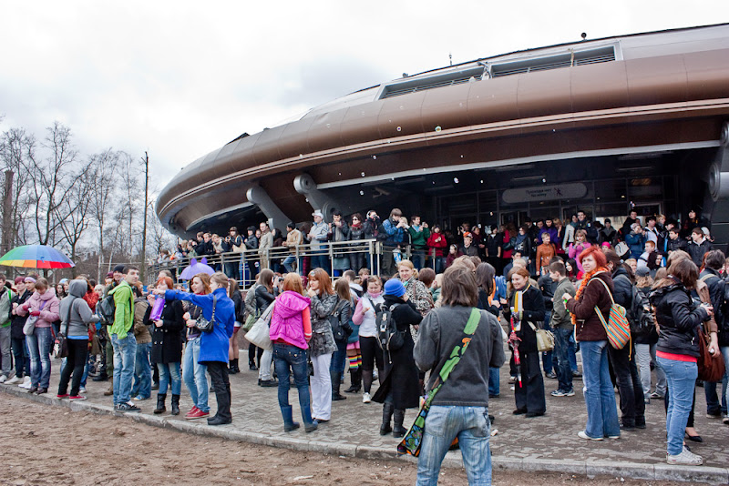 На площади перед станцией метро собрались около 500 молодых людей, которые принесли с собой мыльные пузыри, яркие зонты и шарфы, намереваясь встретить весну. Уже несколько лет подряд подобная акция проводится в Москве - в прошлые выходные, 11 апреля, она состоялась в столице очередной раз, привлекла огромное количество участников, которые радостно пускали пузыри и фотографировали многоцветную толпу.