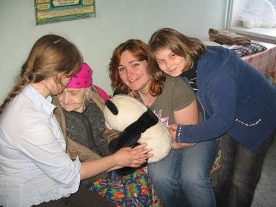 Щукино дает нам заряд и силы на целый день. Во-первых, там приветливый персонал и отзывчивые бабушки, которые радостно с нами общаются, во-вторых, там кормят)). В Щукино мы расфасовали печенья-зефиры-мармелады и пошли петь, устраивать беспроигрышную лотерею и пускать мыльные пузыри. В середине концерта к нам присоединились Марина, Женя и встретившая их Эвелина. Девчонки быстро включились в общую движуху, и мы отправились по палатам собирать приветы. Приветы вам, наверное, все уже передали, а мы пока общались с лежачими. У одной бабушки над кроватью висел плакат с котятами – Милочкой и Казимиром, с которыми она дружит и иногда разговаривает. А вообще, там просто очень хорошо.