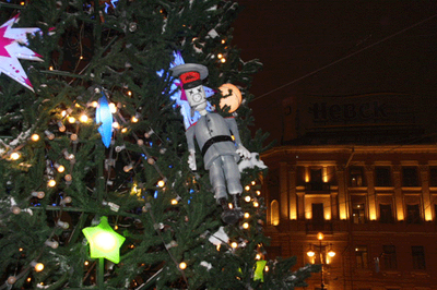 Утром на новогодней елке около станции метро "Площадь Восстания" появились несанкционированные "украшения" - активисты Движения сопротивления им. Петра Алексеева водрузили на новогоднее дерево фигурки "капиталиста", "чиновника", "попа", "нациста" и "мента".