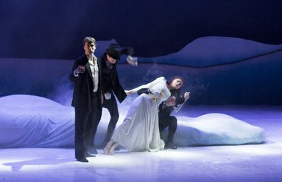 Пару лет назад Жанти встретил на одном из театральных фестивалей группу молодых норвежских артистов, которые его буквально заворожили, поразили своими возможностями. И он решил воссоздать с ними свою постановку. Но если раньше декорации были черными, то теперь они стали белыми, снежными, и актеры встали на короткие северные лыжи, заскользили  по гладкому полиэтилену сцены.-