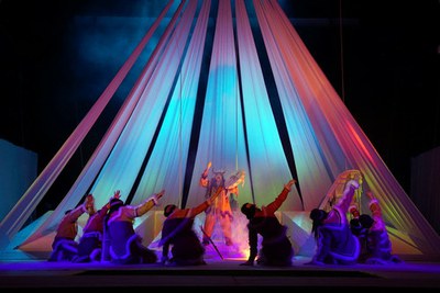 Простое, но изобретательное сценографическое решение спектакля принадлежит народному художнику Республики Тува Начыну Шалыку. Белый трехчастный пандус (его рабочая плоскость поделена двумя глубокими проходами-выемками), несколько свисающих с колосников отдельных нешироких белых полотнищ и свет «от Александра Кибиткина и Светланы Николаенко» превращают сцену то в мертвое заснеженное поле, то в индейский вигвам с пылающим костром, то в оживленный поселенческий городок. Эффект от незначительных «перестановок» стоит понаблюдать на юных зрителях, настолько захваченных вкупе действием и музыкой, что вопрос «А что, уже конец?» здесь звучит из уст каждого третьего ребенка в партере. Впрочем, думается, на ближайшем фестивале «Арлекин» спектакль произведет не меньшее впечатление и на профессионалов...