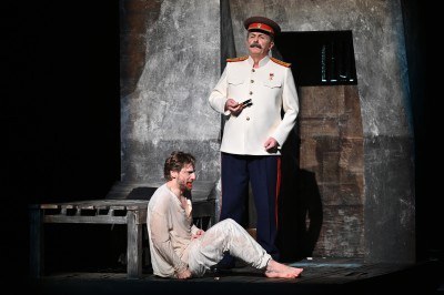 Фокин постоянно провоцирует зрителя к обрушению в буквализм восприятия. В ход идет и чтение Кобой/Кошевым стихов на грузинском языке и несколько выходов на авансцену настоящих грузинских мальчишек, мастерски продающих газеты (трюк с детьми на сцене всегда работает безотказно). Режиссер, не стесняясь, подстегивает в зрителе эмоциональные срывы. Страшны и сцена шантажа «мецената» Бархатова (Александр Лушин), и изнасилование Ольги на могиле ее отца, убиенного по приказу Кобы, и явление в морге нагих загубленных бывших друзей будущего «вождя народов». Фокин идет и на предельную провокацию. Он оживляет труп – ходульный образ Сталина, словно из финальной сцены фильма «Падение Берлина»: белый китель, двойные красные армейские лампасы, звезда Героя Советского Союза. Петр Семак в этой роли – чудо перевоплощения... И зритель «ведется» на эти подначки, путает местами реальность и сценическую условность, «теряет нюх» на правду и вымысел и, не понимая, что с ним происходит, перестает абстрагироваться, окончательно теряет способность к анализу и впадает в неприятие.
