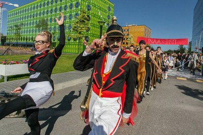 "Приехали!" –смесь цирка нуво, буффонады и уличного театра (идея Упсала-Цирка, творческой мануфактурой ПТХ и кабаре-бэнда «Серебряная свадьба».