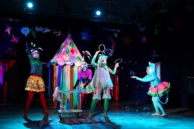 Художник Наталия Клемина насыщает спектакль всеми возможными яркими оттенками основных цветов. Атмосфера прездника, цирка, иллюзия соучастия маленьких зрителей в происходящих событиях поддерживается интерактивом: герои периодически обращаются к залу с вопросами о том, каких зрители знают цирковых артистов, или, какие инструменты могут понадобиться для строительства дома. Ребятне в Белом зале отведены банкетки, составляющие отдельный, «литерный» ряд амфитеатра. Но несмотря на то, что родители не контролируют маленьких зрителей, к чести последних (а также, конечно, исполнителей!) надо отметить: случаев «покушения на вмешательство в действие» не наблюдается. Зато вполне официально детей допускают на площадку по окончании спектакля: фотосессия с артистами – неизбежная примета времени и педагогически верный ход, позволяющий получить вещественное доказательство тому, что театре – это праздник, который может быть всегда с тобой.