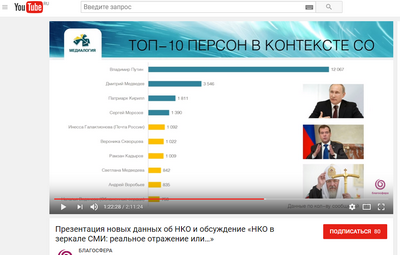 Директор Центра исследований гражданского общества и некоммерческого сектора НИУ ВШЭ Ирина Мерсиянова представила своё многолетнее исследование (презентация И.В. Мерсияновой). Исследование охватило публикации в СМИ за период с 2012 по 2016 годы. В выборку для анализа вошли 10 012 статей в российских СМИ и 5014 сообщений социальных медиа (см. отчёт АСИ).
