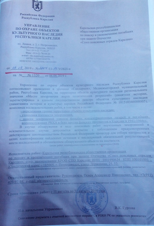 8 августа 2019 Управление по охране памятников Карелии согласовало действия РВИО в Сандормохе