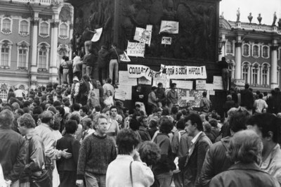 Следующим сюжетом, который добавил радости всем нам, был концерт на Дворцовой «Рок против танков». Этот концерт был не только для всех петербуржцев. Концерт был для каждого из нас, тех, кто все эти дни и ночи не сломался и не смирился с возвратом в прошлое, которое нам пытались навязать ГКЧПшные старперы.