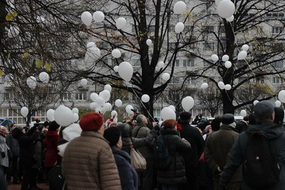 Петербургское общество "Мемориал" на митинге раздало 500 белых шариков. Всем предлагалось написать на шарике что-нибудь: имя своего репрессированного родственника, год ареста, ссылки или расстрела, любые другие слова. Молодой человек, надувавший шарики гелем, тоже решил поучаствовать в митинге. На двух шариках он написал: "Олег Навальный" и "Каждому фигуранту т.н. "Болотного дела" и отпустил их в небо. Кто-то передавал шарик приведенного на митинг внуку, кто-то довёз его до Левашовской пустоши.