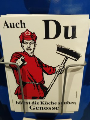 На выходе из музея можно купить открытки с изображениями в стиле соцреализма. На них советский рабочий по-отечески приобнимает восточногерманского коллегу. В воздухе развеваются флаги ГДР и СССР. Открытки пользуются у посетителей успехом.
