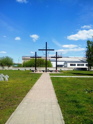 И в промзоне на въезде в Рязань наткнулись на странный квадрат земли с тремя черными крестами, перевитыми колючкой.