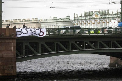 Вчера, 9 октября 2017, в Петербурге в память о Борисе Ефимовиче Немцове участники движения "Весна" вывесили баннер "Борись!" на Дворцовом мосту и выпустили в небо 58 воздушных шаров.