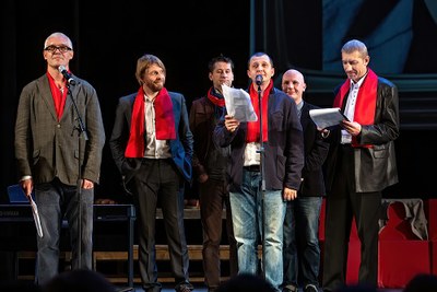 Чем ближе юбиляры продвигались к нашему времени, тем атмосфера на сцене становилась все серьезнее. Выпускники третьего набора начинали с киносюжета по мотивам известного романа Достоевского: сцена в поезде (Рогожин, Мышкин, Фердыщенко). Ведь они заканчивали обучение дипломным спектаклем «Идиот. 2012». «Юбилейный» Рогожин хотел петь песню и выпивать за педагогов. Мышкин почему-то боялся прыгать на батуте. А где Достоевский, там и двойники: на сей раз, расщепили самого Спивака, и вот уже два мэтра в кепариках и очках делали творческое внушение сразу двум футбольным командам.