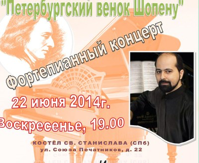 Фортепианный концерт "Петербургский венок Шопену" состоится в воскресенье в 19 часов в костёле св. Станислава по адресу ул. Союза Печатников, 22. , на фортепианный концерт "Петербургский венок Шопену". Выступит Андрей Иванов.