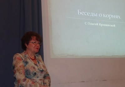 16 декабря 2014 в Интерьерном театре на Невском, 104, состоялась вторая «Беседа о корнях». Героем мероприятия стала на этот раз Ольга Константиновна Крокинская, доктор социологических наук, профессор Российского государственного педагогического университета им. А.И.Герцена. Родилась она в Самаре (в те годы – Куйбышев), училась в Новосибирском университете. Живёт в Петербурге с середины 1970-х годов, преподает, занимается вопросами социологии образования, культуры, гражданского общества, когнитивной социологией, социосемиотикой. Только за последние 5 лет опубликовано 112 ее научных работ.