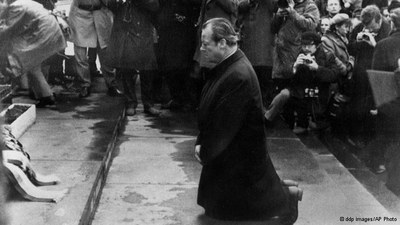 Это была очень трудная поездка: в декабре 1970 года канцлер ФРГ Вилли Брандт приехал в Варшаву, чтобы подписать соглашение, легитимирующее границу между ПНР и ФРГ на Одере и Нисе. После официальной процедуры он возложил цветы к Могиле неизвестного солдата и отправился к Памятнику Героям гетто. Там он также возложил венок. «Торжественным жестом, – как написал свидетель этого события, - Брандт расправил концы венка, хотя они лежали ровно. Сделал шаг назад по мокрому граниту и на мгновение застыл в учтивой позе политика, возлагающего венок. А потом он рухнул на оба колена, сложив руки и опустив голову» [1]. Брандт не согласовал этого жеста ни с кем ни с польской, ни с немецкой стороны.
