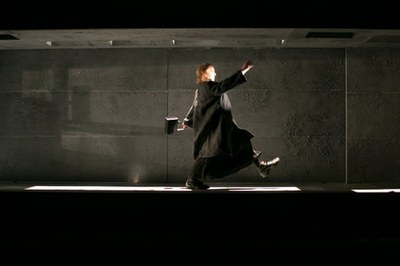Автор спектакля, имеющий репутацию продвинутого экспериментатора в области сценического синтеза, в своем высказывании максимально (насколько это вообще возможно в работе с абсурдистским материалом) серьезен. Используя наиболее актуальные постановочные тенденции и театральные технологии, режиссер жестко-иронично акцентирует злободневные культурно-политические мотивы, купируя все «лишние» детали литературной первоосновы (вплоть до списка действующих лиц – программка содержит только имена исполнителей). При всей нарочитой внешней фантазийности зрелища, зрителю достается лишь самый минимум сомнений относительно причастности сюжета сегодняшнему дню, словно бы предсказанному драматургом несколько десятилетий назад.