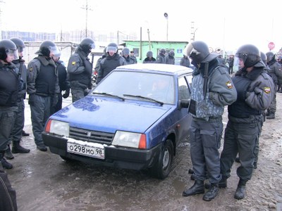 Вдруг к месту въезда в их гаражный кооператив (Парнас-2, Проспект Энгельса 160) приехал милицейский наряд. Человек сорок в масках и без. Выстроившись в ряд, стражи порядка встали в оборонительные позы. То же самое сделали и защитники, которых было чуть больше – 60-70 человек. Они пытались сгруппироваться, чтобы закрыть въезд своими машинами, но стушевались и так и не смогли выбрать из своего числа водителей, готовых эти машины предоставить. Боялись… Зато более активно проводились работы по сооружению баррикад. Представитель районной администрации Арина Александровна убеждала милиционеров и приставов «разрезать ворота», но никаких активных действий так и не наступило.