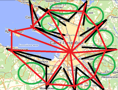 В пространственно-географическом развитии города должна наблюдаться также плановость и развитие. На рисунке показаны основные векторы развития города (черные линии). Между ними обязательно должны оставаться зеленые зоны, «лёгкие города» (зеленые круги). Красным - отмечены основные транспортные магистрали общественного транспорта.