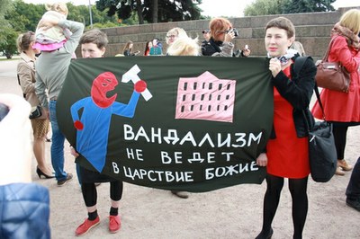 «В России никогда не знаешь, откуда придёт беда, на место одной головы дракона тут же вырастает другая. Помимо войны с братьями во Христе, которую как бы мы и не ведём, неосталинизма и множества других «измов», от большевизма до пунитизма, включая приметы фашизма, приключилась война внутренняя – война правильно верующих, у которых есть чувство, способное оскорбляться, со всем остальным народом, у которого, по-видимому, такого чувства нет и быть не может. Ущемление в праве последних всячески поддерживается государством, это видно теперь невооружённым глазом, и развязывает руки для вандализма со стороны радикально настроенных церковников. Что же делать светской части общества, чьи чувства верующих, агностиков или атеистов всячески оскорбляются новоиспечённой церковной агрессией или поддерживающими эту вакханалию чиновниками? Как спасти своё достоинство? Каким способом отстоять своё право на сохранность памятников культуры? На своё представление о России как о государстве светском? И мне думается, прежде всего надо действительно оскорбиться. До боли, о комка в горле, до желания выйти из фейсбука. Выйти для того, чтобы консолидировать силы здравомыслящих, образованных, ответственных горожан. Надо проявить не свойственную нам солидарность сопротивления. Надо поддержать лидеров гуманитарной культуры, которые заявляют о совей позиции и несогласии с происходящим. Я хочу спросить студентов творческих вузов, работников музеев, историков, артистов, архитекторов, врачей, учителей, - назовём это просто, банально творческую интеллигенцию: где вы все? Проснитесь! Не повторяйте свой исторический опыт. Мы призваны другим поколением сохранить и передать всё, что было накоплено до нас. Неужели нас меньше тех, кто навязывает нам новые стандарты морали? Тогда чего же мы все боимся? Мы должны использовать все правовые возможности, чтобы переломить ситуацию. Моё чувство верующего глубоко оскорблено актами вандализма по отношению к культурным объектам и фактическим отсутствием наказания за бесправный самосуд. И в конце концов, может быть, надо требовать симметричного закона о защите прав чувств верующих светской части общества. Надо требовать ответственности и наказания за вандализм. Нерешение этих вопросов рано или поздно переведёт их в политическую плоскость».