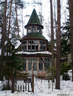 Жители посёлка между собой прозвали эту дачу дом-фонарь из-за лёгкой башенки, венчающей третий этаж зеленоватым конусом, словно гномьим колпаком. Три этажа, веранда. Характерный узор на коньке крыши – снежинка. Архивные данные свидетельствуют, что участок, на котором находится этот дом, раньше назывался «Ляндшен», и принадлежал он с 1906 по 1917 год Валентине Чириковой, жене писателя Е.Н. Чирикова (супруги Чириковы на фото справа). Сохранился портрет Е.Н. Чирикова работы И. Репина, с которым писатель дружил и часто ездил к нему в гости в Куоккалу (ныне посёлок Репино) в Пенаты. После революции Чириков эмигрировал. У него были причины: в литературе он зарекомендовал себя как писатель с народническими взглядами. Несмотря на то, что, живя вдали от родины, писатель серьёзно изменил отношение к политике, а для своего литературного языка нашёл совсем иные интонации и оттенки, в России до недавнего времени были известны только рассказы Чирикова о последних русских романтиках, мечтающих о свободе и просвещении.
