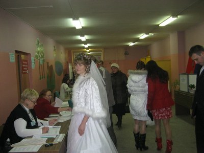 Оживление вызвало появление на участке жениха и невесты, которые даже в такой важный день все же пришли на выборы. Под аплодисменты присутствовавших молодоженам был вручен небольшой сувенир на память с искренними пожеланиями мира, любви и счастья.